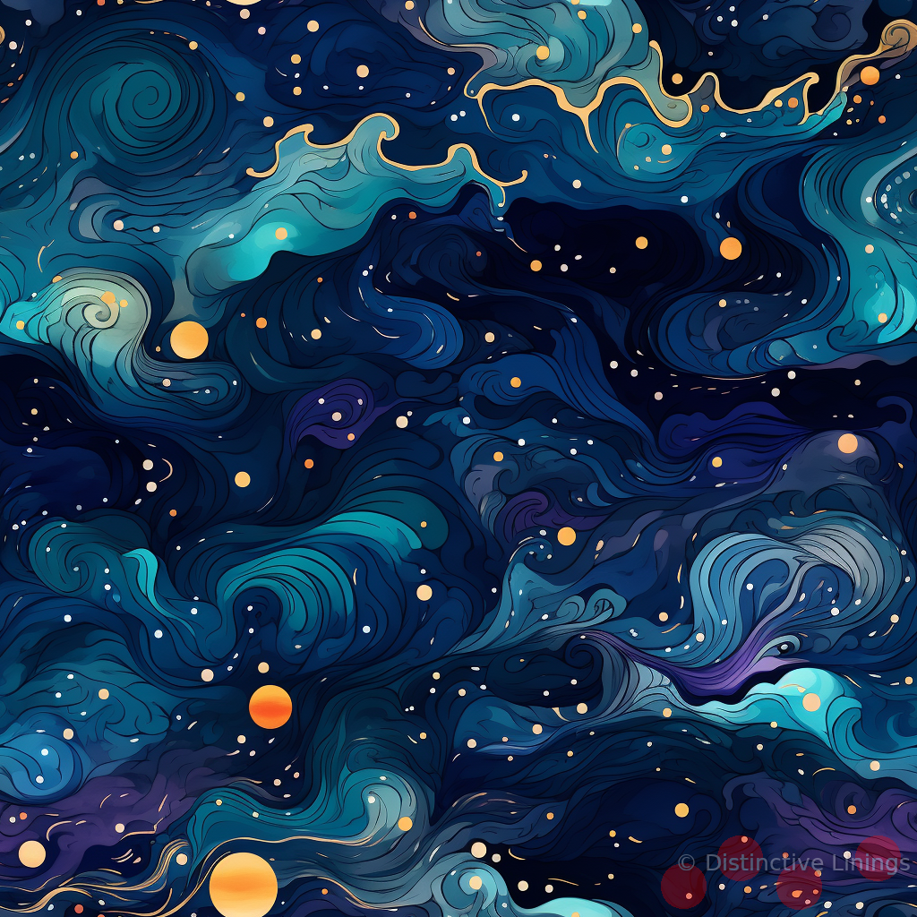 Experience an otherworldly delight with this jacket lining design. Drawing inspiration from Neo-Dada, its visual narrative is reminiscent of celestial maps as seen through a creative lens. The main canvas possesses a captivating hue of midnight blue, fused with stimulating splashes of steelblue, teasing the curiosity of onlookers.