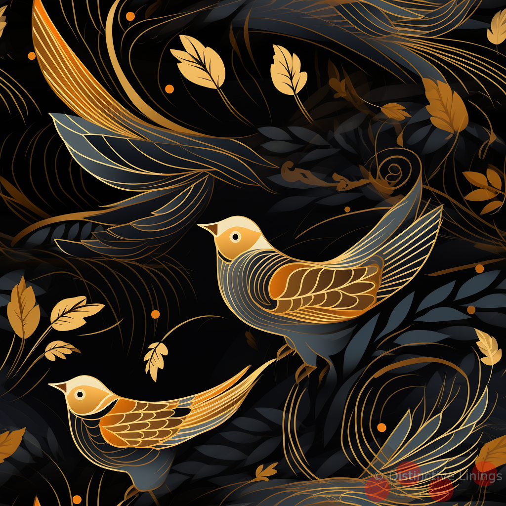 Dip into the realm of expressionism with our exclusive jacket lining. Rich hues of 'Peru', 'Black', 'DarkOliveGreen', 'DimGray' and 'Gray' coalesce to trace the energetic contours of chirping birds. The golden accent riveting across the shoulder bestows an elevated touch, accentuating the finesse of the design. A perfect blend of unconventional aesthetics, the lining has been crafted to reflect exclusivity. Made-to-measure, this custom lining elevates your jacket's appeal, making it a statement piece for any trendsetter. With its unique storytelling artwork, it’s not just a lining, but a canvas where art meets fashion. Enjoy the spotlight as this piece brings your persona to life with its sheer elegance and sophistication.