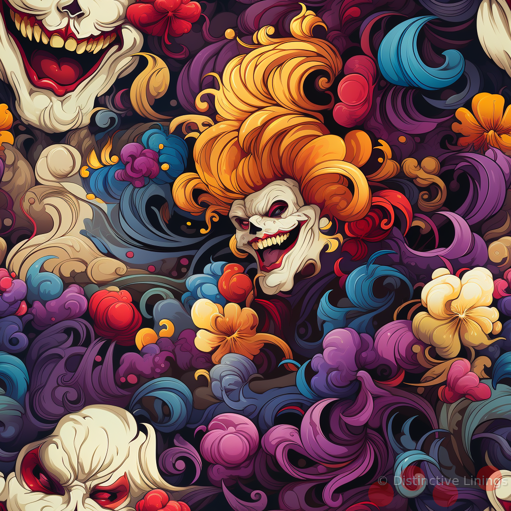 Dive into a world of whimsy with this captivating jacket lining that takes a touch of inspiration from the vivid and playful world of children's book-style artistry. An intriguing circus theme courses through the design, bringing forth a bold visual display of eccentric clowns, evoking a sense of carnival enjoyment and dynamic chic style in every detail.