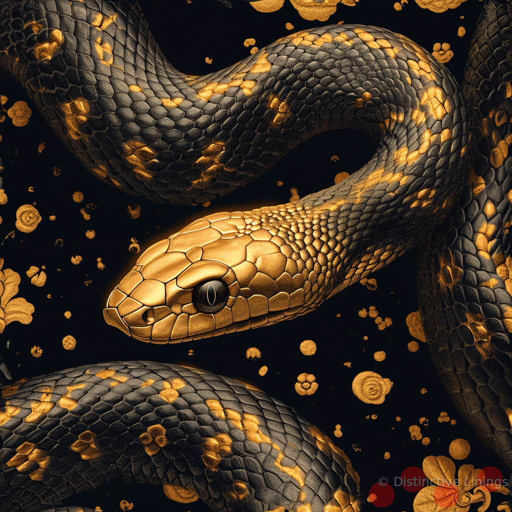 Dive into a realm of graphic novel inspired design with this exceptional jacket lining. Boasting a captivating cobra pattern, it seamlessly weaves a story of intrigue and adventure. Set against a shimmering gold backdrop that emulates the color "peru", the design comes alive in an electrifying play of 'black', 'darkolivegreen' and varying shades of 'gray'. The powerful contrasts and dramatic interplay of colors have been artfully rendered in the style of an iconic graphic novelist, infusing your tailor-made jacket with a twist of edge and suspense. More than just a lining, this design celebrates the personal style and daring spirit of those bold enough to wear it.