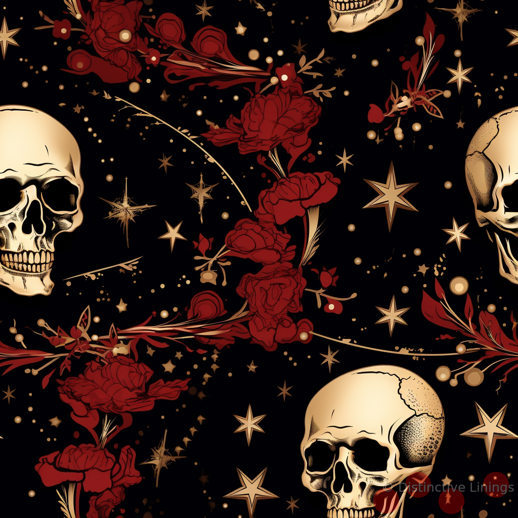 Awash with boldness and artisanal aesthetic, this exclusive jacket lining draws on the unique influence of country art. The central design is characterized by a commanding skull image, invoking a compelling sense of intrigue and individuality. Embellished in striking shades of black and dark red, the design breathes life into the understated elegance of the tan and dim gray backdrop. Its distinctive character makes it an impeccable choice for those seeking to invest in a one-of-a-kind, made-to-measure and custom jacket. Adorn your attire with this captivating lining, and let your style make a fearless statement.