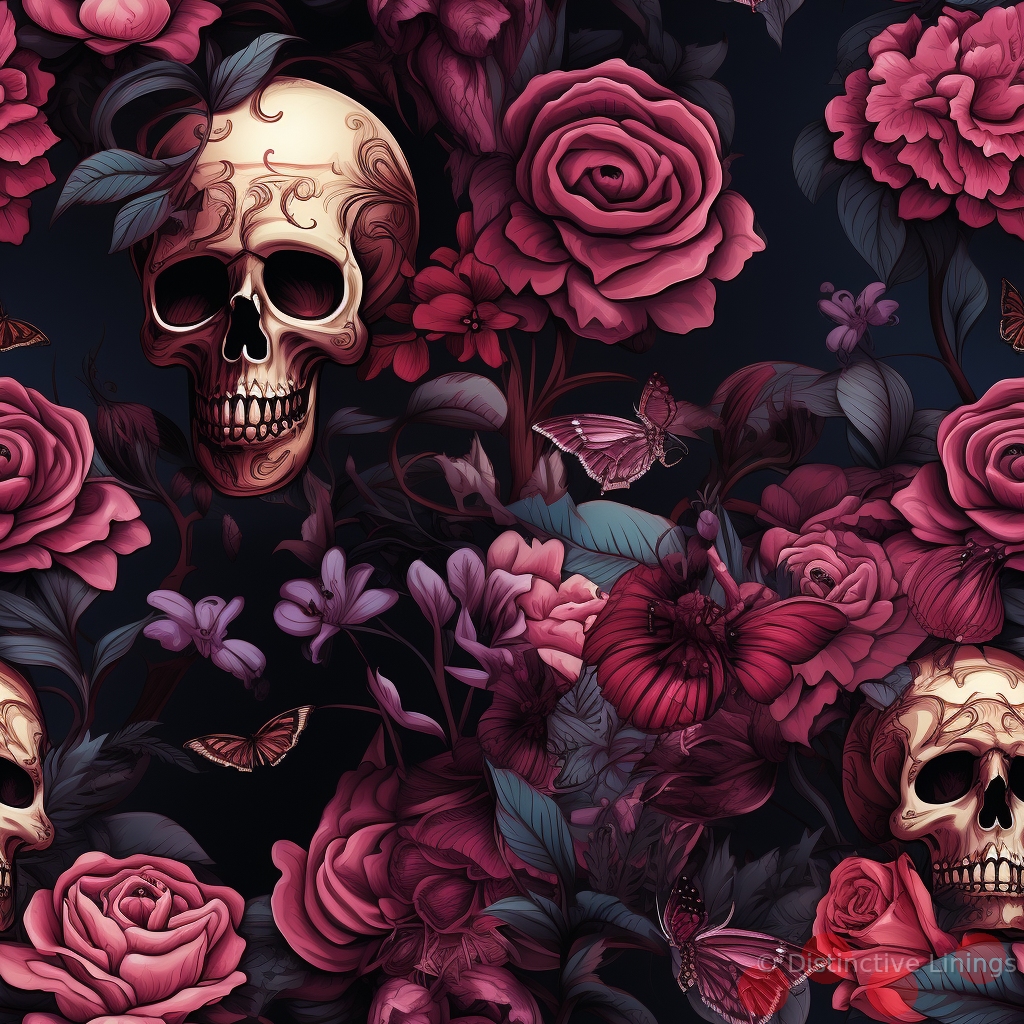Immerse yourself in the uniqueness and intrigue of this exclusively designed jacket lining. A beautiful and evocative blend of black and brown tones, accented by pale violet red and a dash of light slate gray, crafts an aesthetic that is second to none. This design draws inspiration from the combined elements of skulls and butterflies, instilling a powerful, yet whimsical and romantic flair to the jacket.