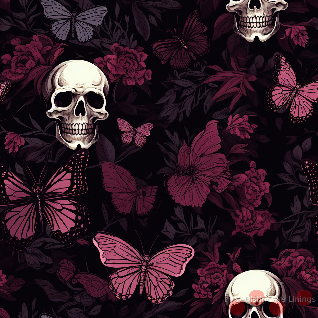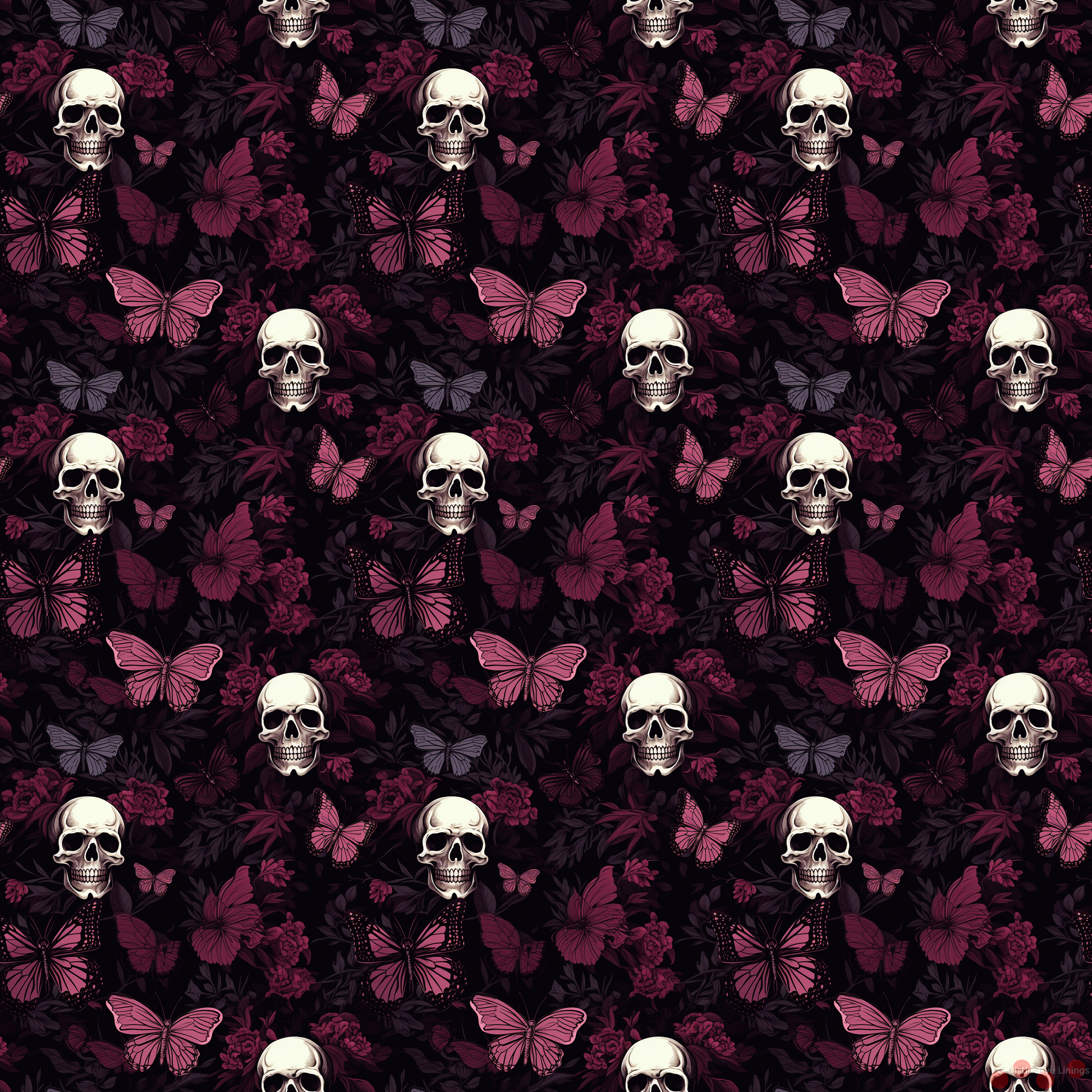 The entwining design of skulls and butterflies represents a thrilling juxtaposition of life and mortality in a dance of exquisite harmony. The enchanting cascade of dark roses and burgundy flowers adds a touch of mystic charm, making it a treat for eyes that appreciate complexity and detail.