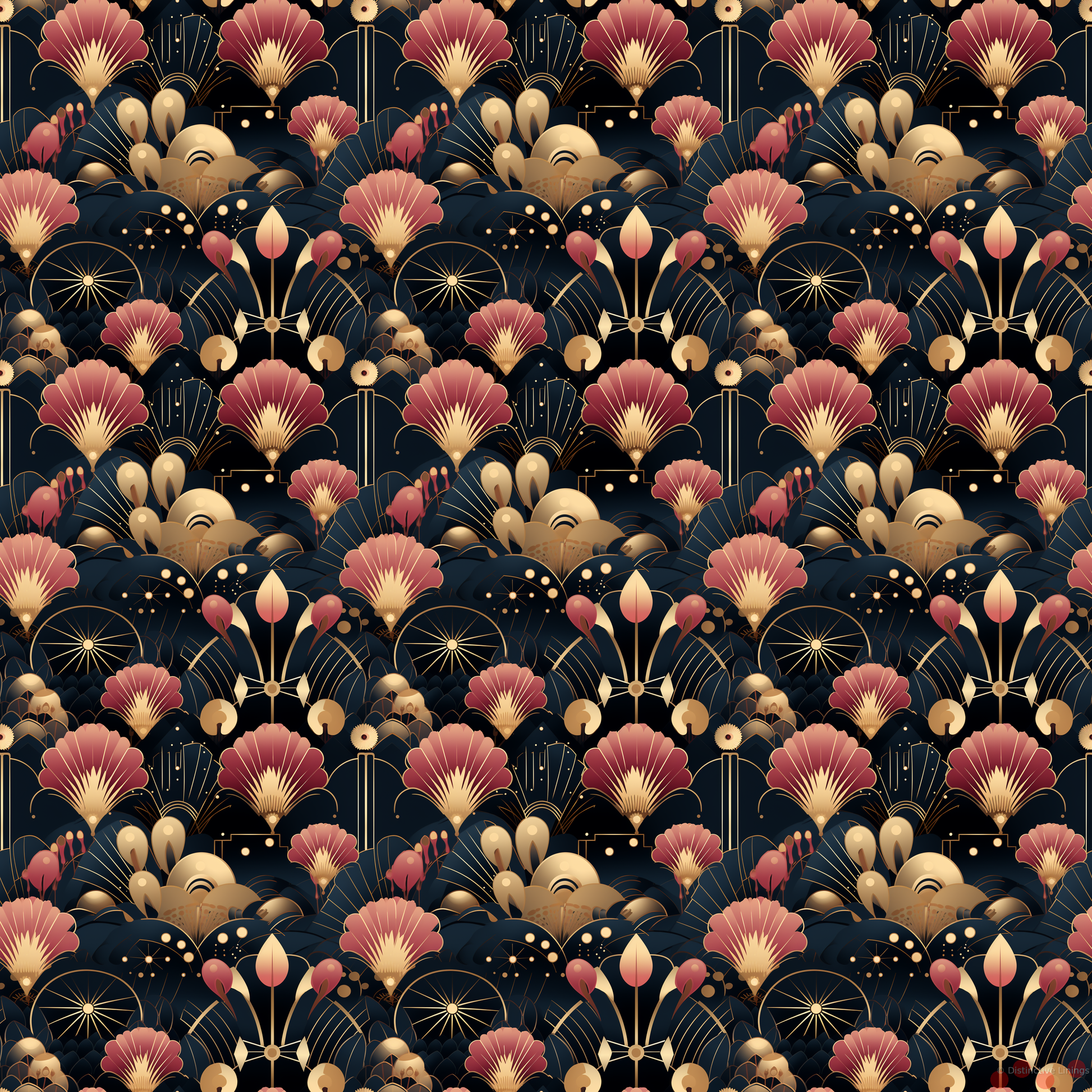 The overall appearance naturally draws attention to the crisp, graphic, and symmetrical nature of traditional Art Deco designs, marking a rich history of extravagance and sophistication. Despite the dominance of darker shades like black and brown, the resplendent contrast brought about by the sparkling dark salmon invigorates the overall visual impression.