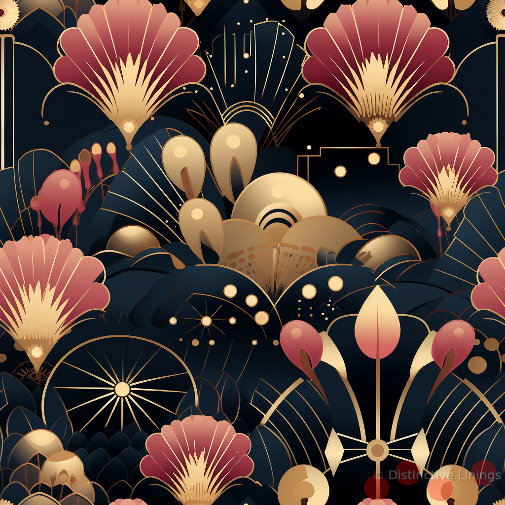 Immerse yourself in the radiant glory of an expansive jacket lining, inspired vividly by the Art Deco era. Adorned with an alluring concoction of dark salmon and brown infused gracefully on a broad canvas of varying hues of gray, this lining carries the essence of a playful motif elegantly painted in a light golden palette.