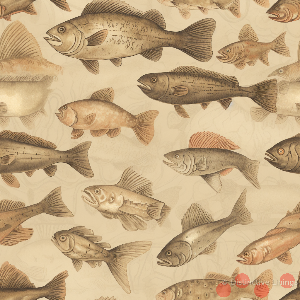 Emanating a unique aesthetic, our exclusive jacket lining captures the essence of subtlety and earthy tones in a realistic style. Boasting an intricate design of fishes, it projects a mesmerizing harmony of color. Layered in a careful balance of tan, dark olive green, and two hues of sienna, this lining is a testament to our commitment to meticulous detail. The understated charm of gray is skillfully interwoven within the design, subtly amplifying the earthy aesthetic. This breathtaking jacket lining, custom-made to accentuate your style, is a celebration of individuality steps away from the ordinary. Explore a new realm of sophistication with this harmonious blend of earthly hues.
