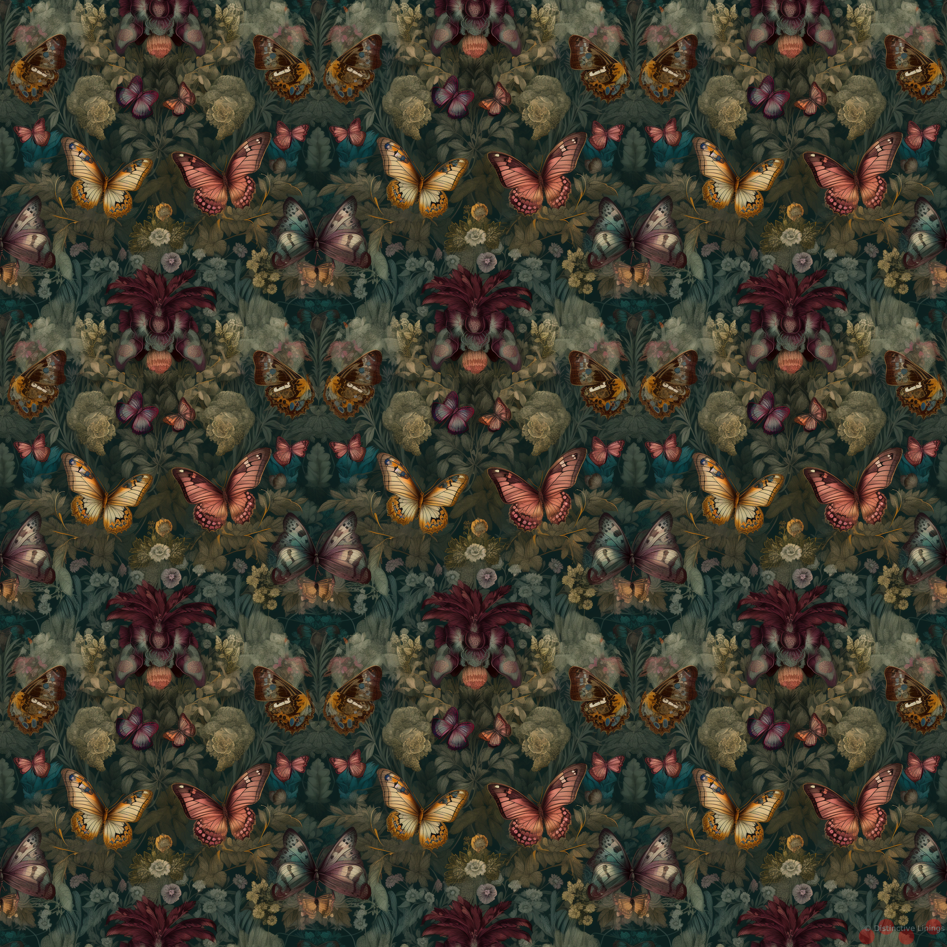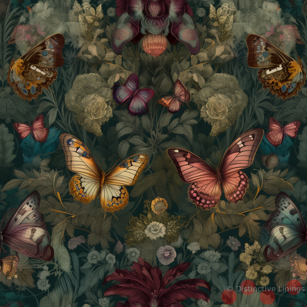 Adorned with a whimsical mix of butterflies and flowers, the pattern evokes an array of emotions. Resonating a quiet elegance, the darkslategray and dimgray tones underpin a more subtle aesthetic. Meanwhile, a pop of Peru adds a dash of depth, bringing life to the fantasy. This playful contrast is rounded out by accent notes in darkseagreen and gray.