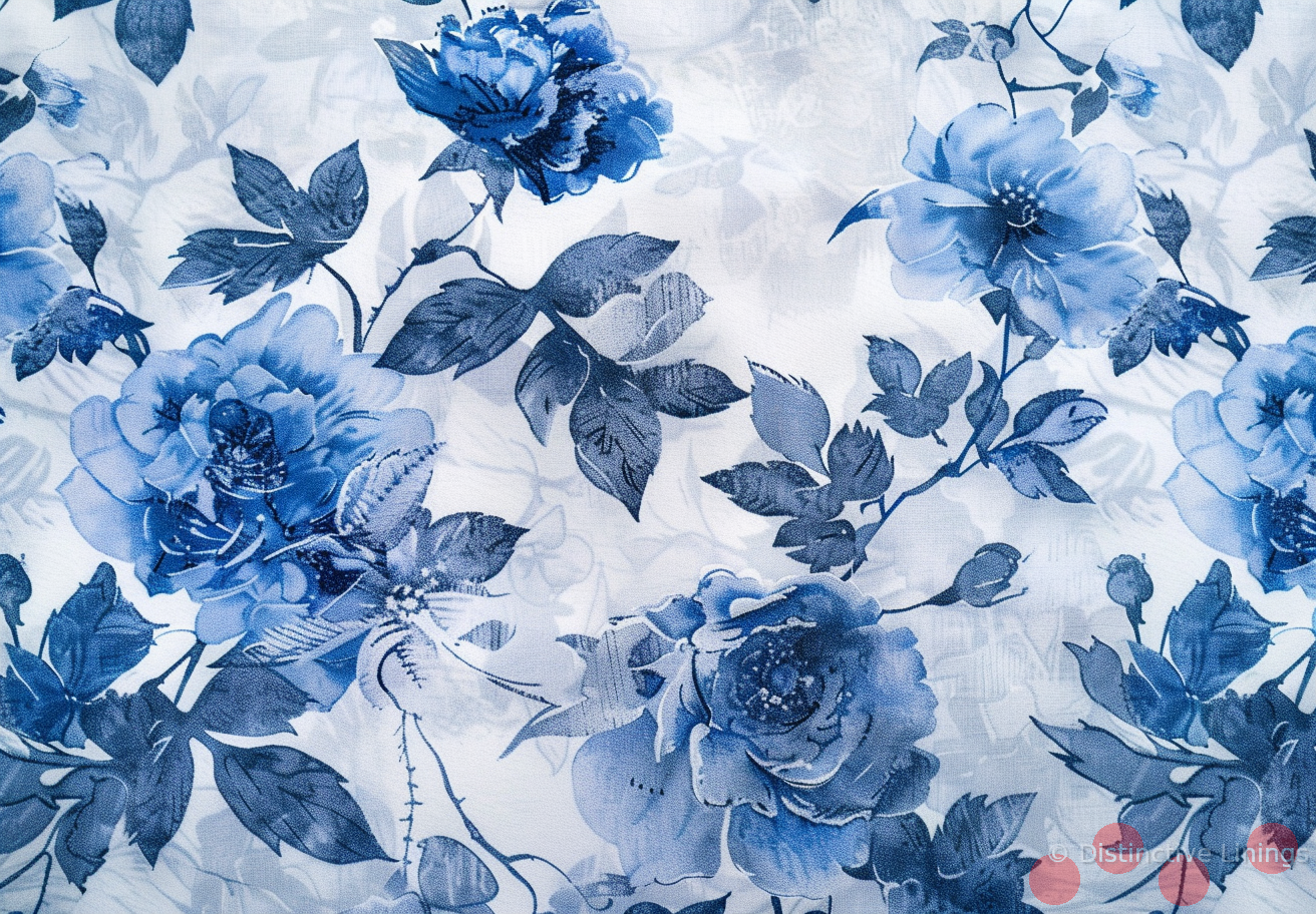 Delicate and stylish, this exclusive jacket lining showcases an eloquent dance of roses and leaves adorned in shades from refreshing cadet blue to rich darkslate blue, set against a canvas of sophisticated light gray. The juxtaposition of the different hues creates a floral pattern that exudes a sense of tranquility and serenity with an imaginative twist.