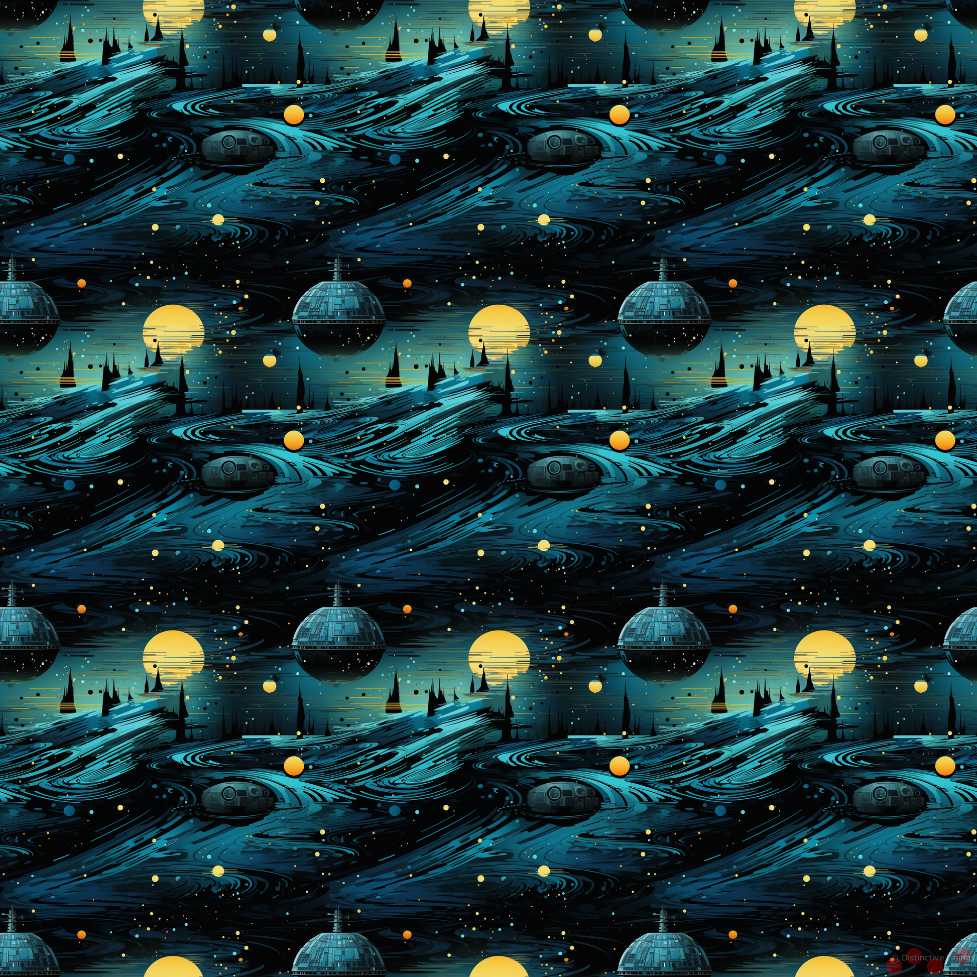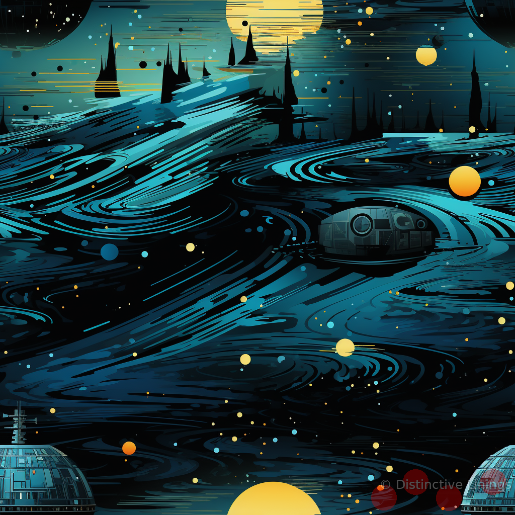 The design, inspired by retro-futurism, oozes drama and intrigue while hinting at the grandeur and power of the universe. The vivid depiction showcases the pinnacles of sci-fi fantasy including interplanetary spaceships, valiant Jedi fighters, and the ominously looming Death Star- a tribute to time-honored themes of resilience and justice.