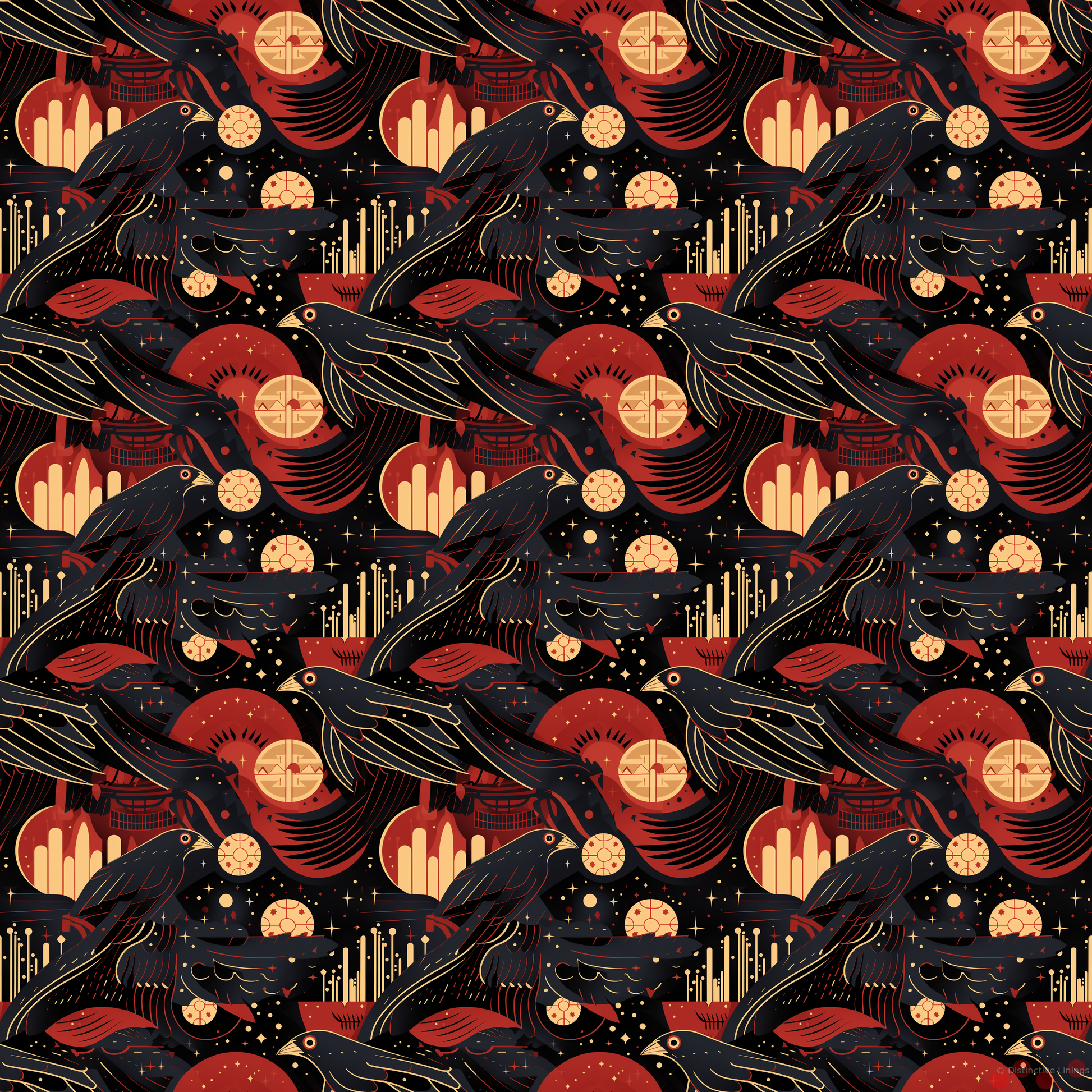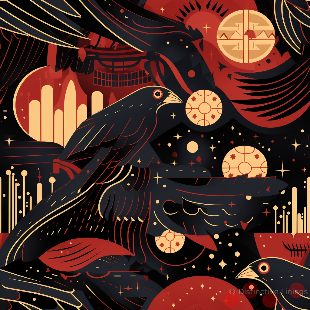 Like a tapestry woven with threads of ruby red and pale gold, the geometric shapes form an intricately layered matrix of patterns. Ravens—a symbol of mystery and intellect—add an extra layer of intrigue, creatively integrated within the geometric shapes. Recalling the time-honored symbolism of the crow and the vibrant colors of precious gems, the design is sure to turn heads and spark conversation.