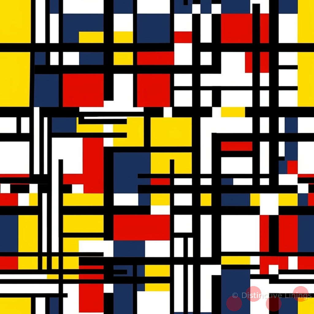 An aesthetically pleasing confrontation of patterns, the lining marries modernist ideals with the passion of individuality. Black lines draw your eyes to gold squares, solid slates of gray, and punctuations of energetic red. The progressive ideals of De Stijl movement are clearly represented, as forms are simplified, and only essential colors are utilized.