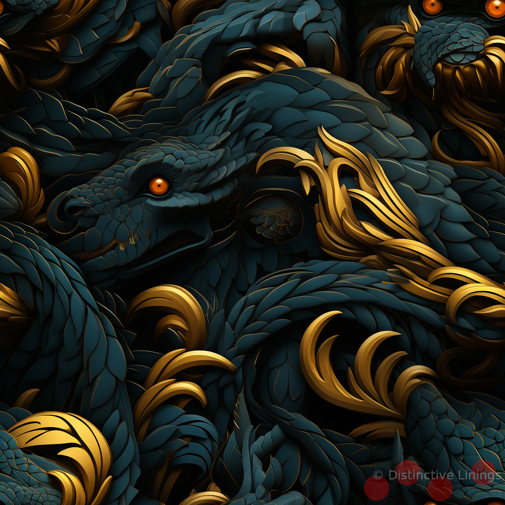 The fluid, sinuous contours of the snakes inspire a feeling of sublime elegance, while the blend of subdued and warm colors gives the lining an enigmatic aura. In contrast, the contrasting shades of grays and browns bring out the intricate details of the design, creating a veritable centerpiece even on the inside of your tailored jacket.
