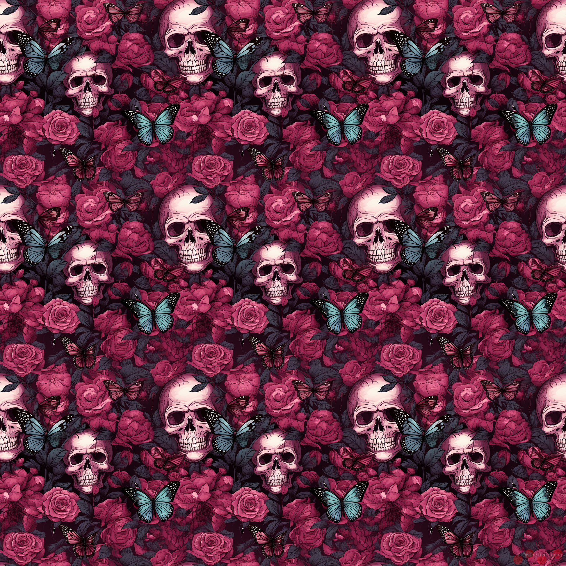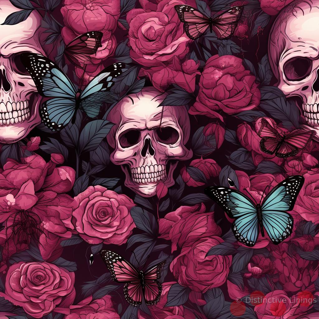The pattern is skillfully presented over a deep and luxurious black base, ensuring optimal color contrast. The delicate balance of pale violet, brown, cadet blue, and light slate grey throughout the intricate pattern enhances the visual appeal of this piece. The butterflies beautifully harmonize with the skulls motif, adding an element of unexpected whimsy to the design.