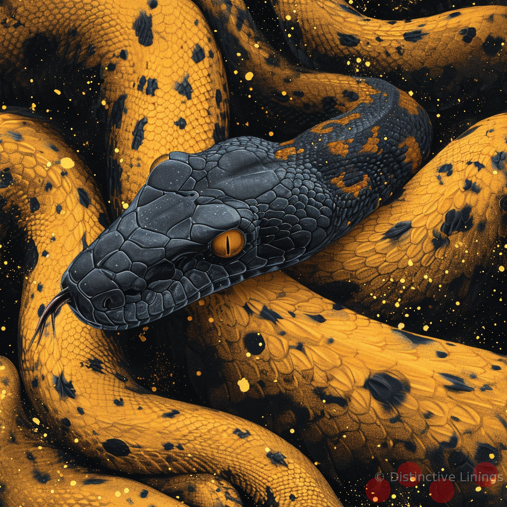 Exclusiveness personified, this jacket lining exhibits an artistic rendition of snakes, neatly painted in a sophisticated black, harmoniously contrasted against a stunning gold background, reminiscent of abstract comic artwork styles. The palette, largely dominated by hues of peru, black, and sienna enhances the striking visual appeal, affirming the look of a bold and daring spirit.