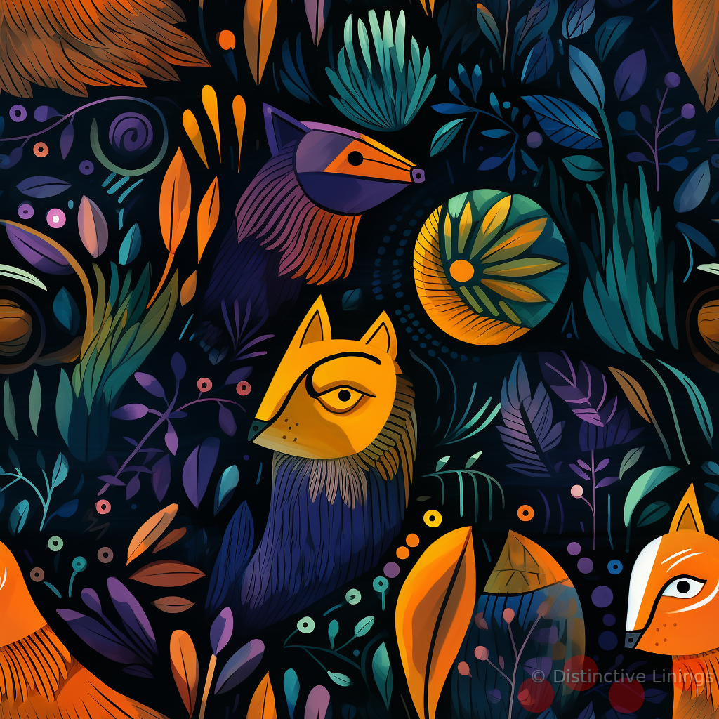 Experience the blending of artistically intricate bars of colors that beautifully flow together in this unique jacket lining. With abundant chocolate hues as its basis, this design is set apart by the dominating presence of black accents. Coherently woven smear of artistry, this jacket lining boasts a sprinkling of dark olive green and cadet blue tones; culminating in an elevated aesthetic essence. Subtle undertones of dark slate blue and chocolate tones reflect an abstract display of lions and birds, inspired by the very essence of expressionism. An embodiment of customized elegance, this lining transforms a simple jacket into a canvas for art and style.