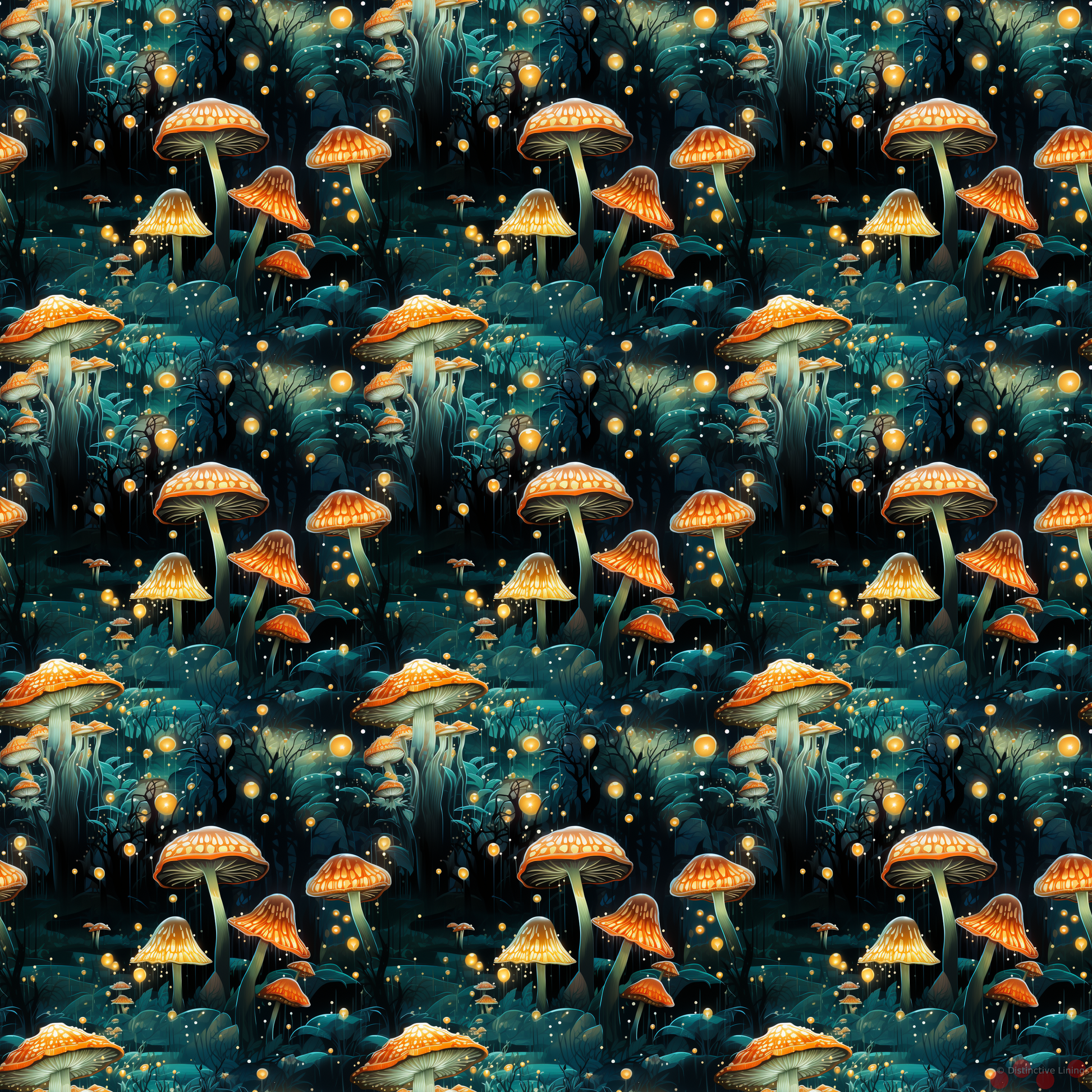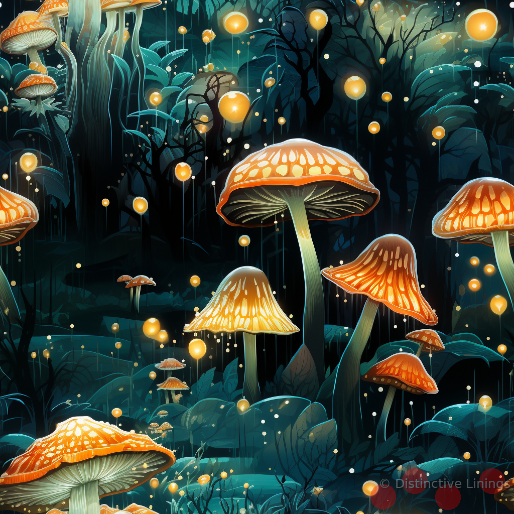 Discover a jacket lining inspired by the mesmerizing world of anime-inspired landscapes. Enchanting gardens of dark khaki stand out vibrantly against the impressive depth of black shades, harmoniously intertwined with sea green highlights. Inviting whimsy, giant glowing mushrooms pop resplendently in hues of cadet blue and steel blue.