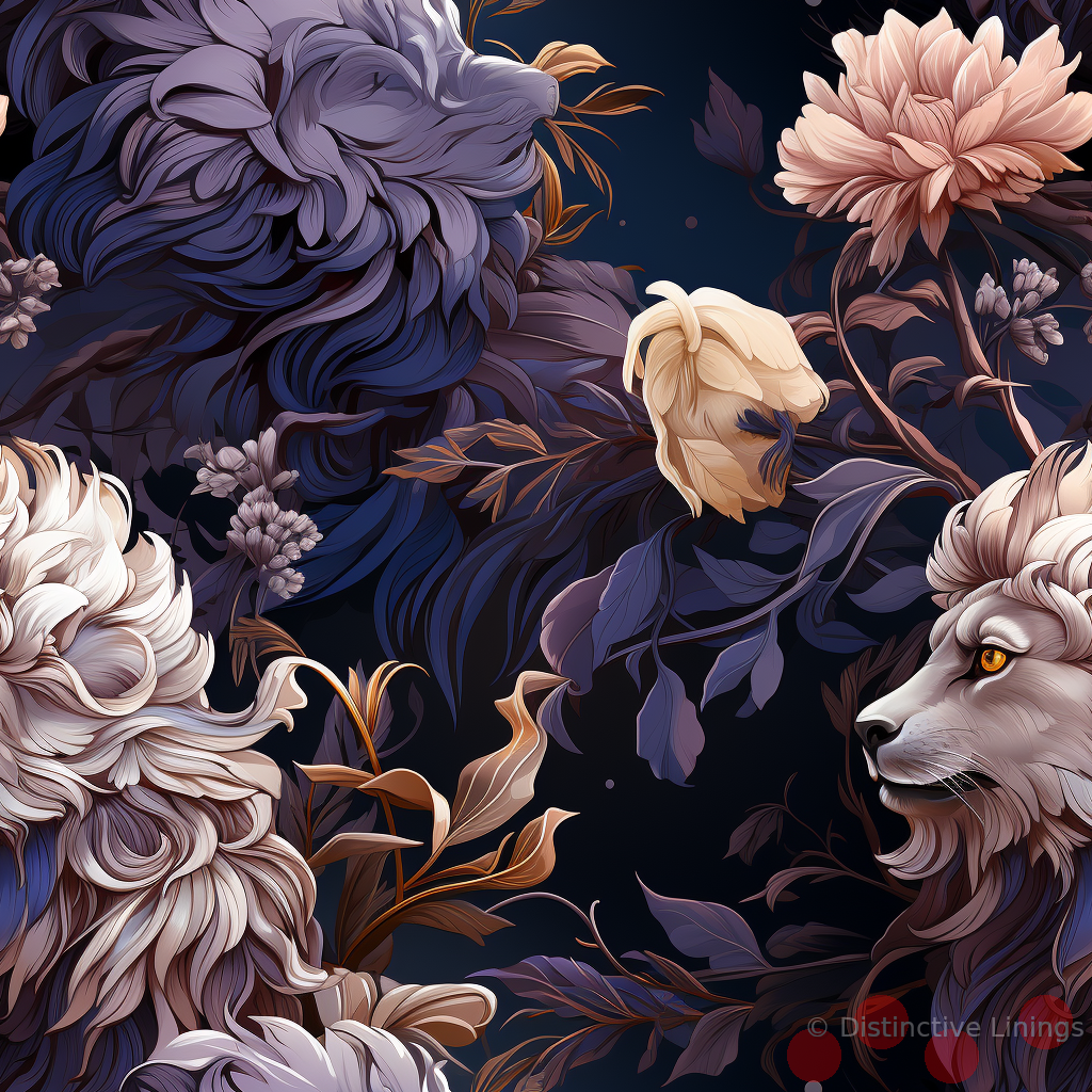 Exude sophistication and a unique personal style with this extravagant jacket lining. Drawing inspiration from the dynamic visual elements of Neo-Classicism, this intricately designed lining features an opulent display of roaring lions and graceful birds, peppered across a vibrant backdrop of royal blue.