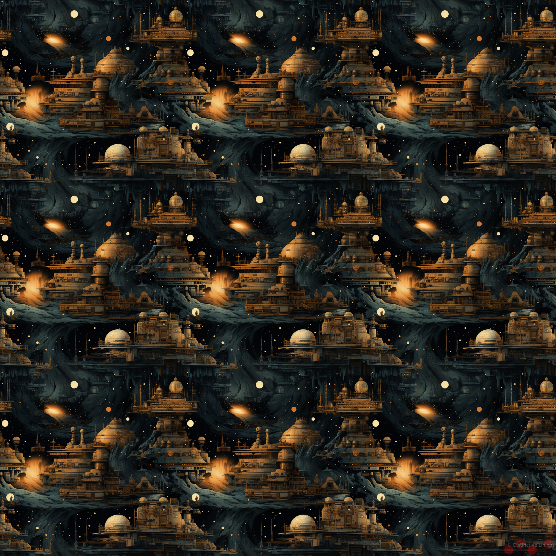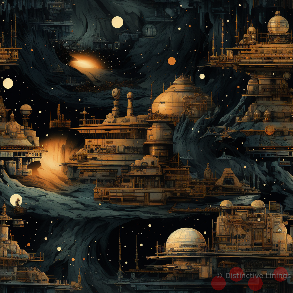 Immerse yourself in an exquisitely designed lining that marries pop culture and Neo-Impressionism. This striking design features iconic figures and celestial objects that evoke a galactic adventure. The detailed rendering of spaceships and enigmatic celestial bodies are set against a deep black backdrop, creating a captivating visual dynamic. A dash of Peru color enhances the complex motif while gray accents offer a balance between the vibrant and brooding elements.