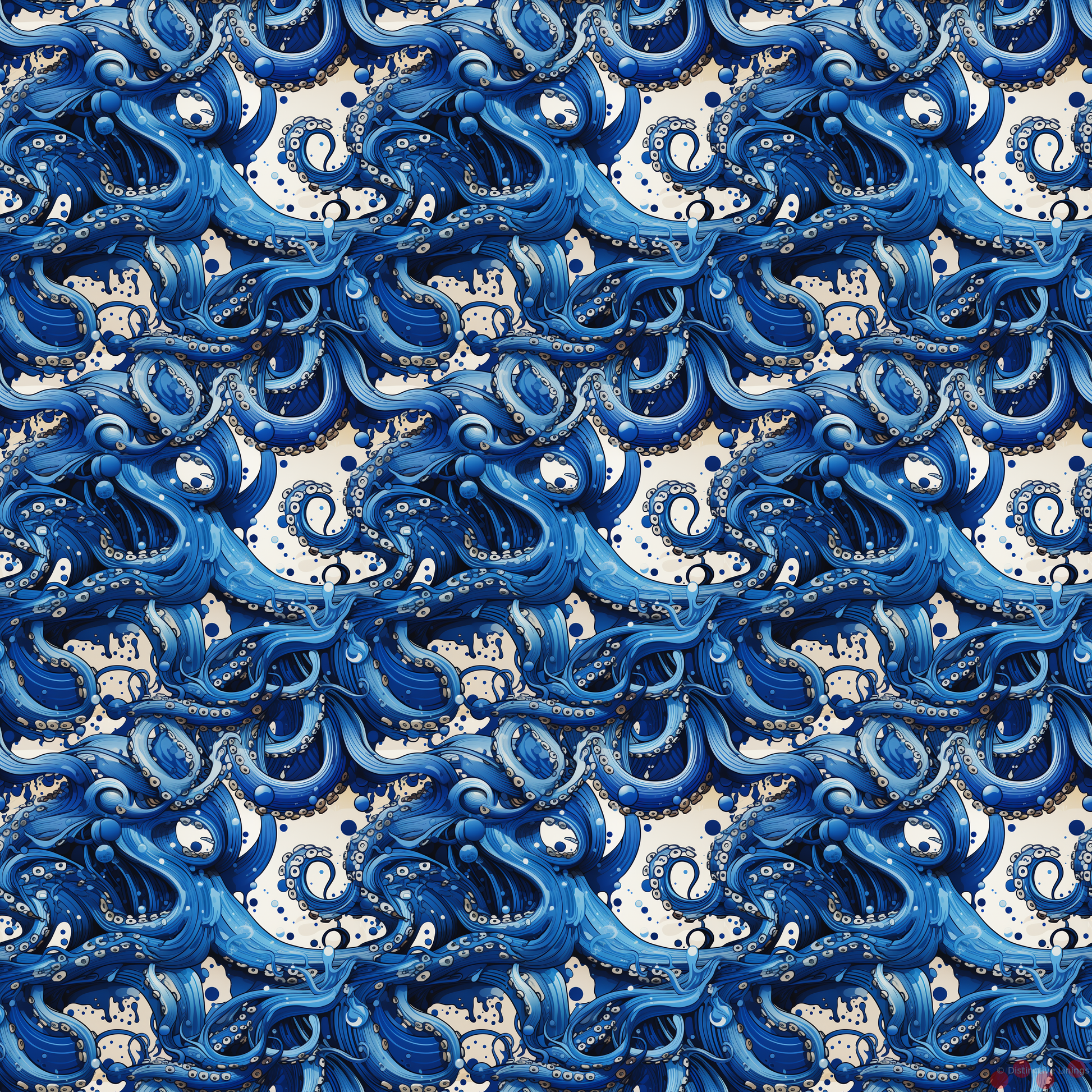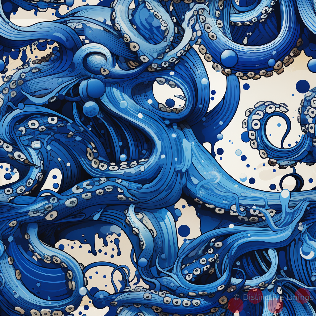 Immerse yourself in its labyrinth-like arrangement of geometric forms, where hints of an octopus add a marine mystique to your wardrobe. Each curve and stroke is a testament to modern style - sharp, audacious, and unapologetically distinct. The vibrant cornflower blue harmoniously coexists with the profound steel blue, highlighting the pattern against a contrasting canvas of mysterious midnight blue, and softened with sweeping light gray tones. Interspersed black details provide a defining edge, making every line pop with artistry.