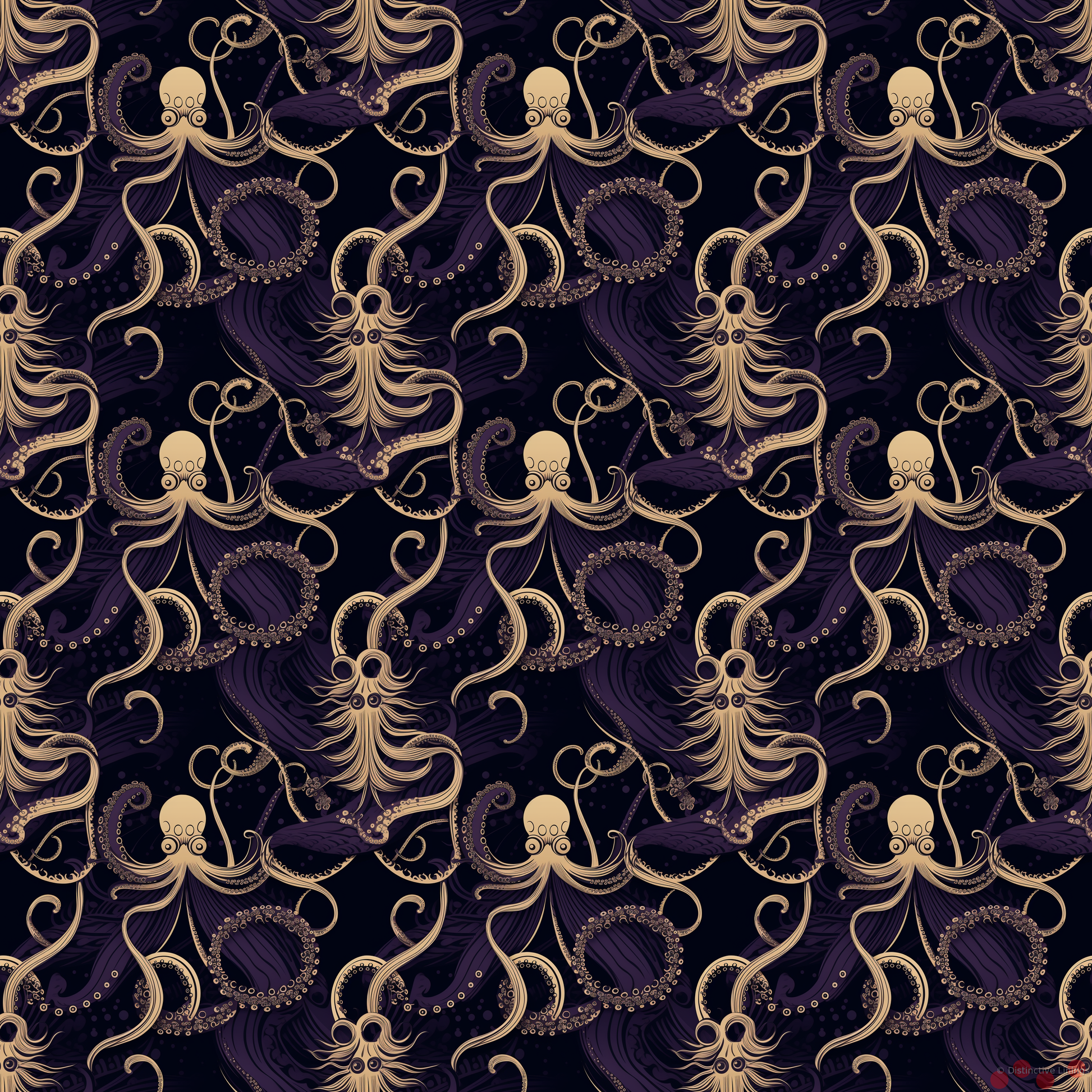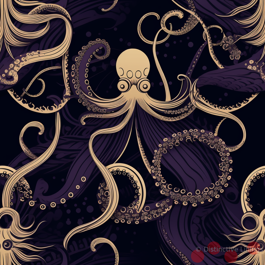 The prominent Octopus figure, characteristically of Art Deco fashion, is brought to life in a spellbinding blend of deep purple and gold. This distinctive figure is expertly juxtaposed against a mature palette of tan, black, and dark olive green - a truly remarkable representation of refined aesthetics and artful expression.