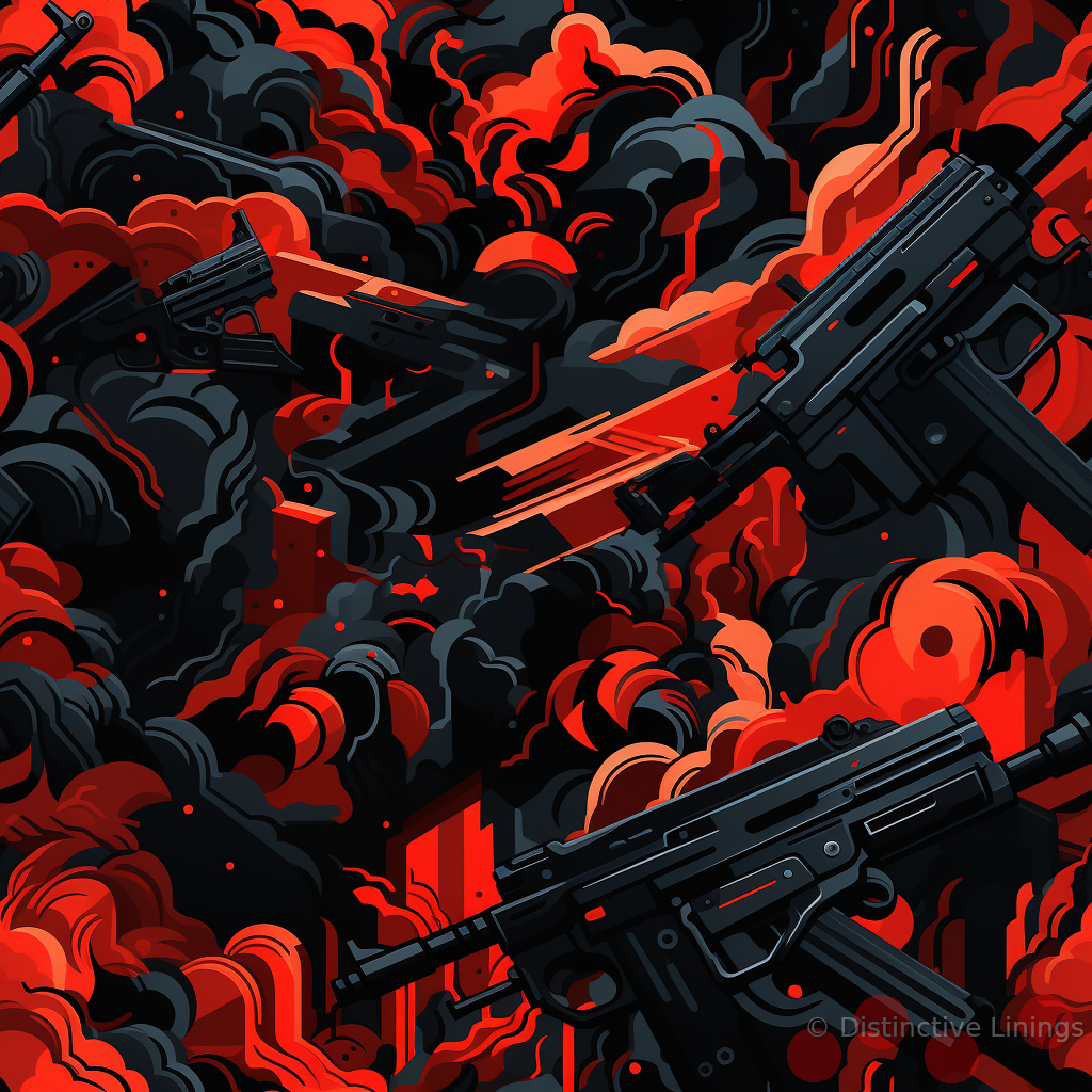 Experience a sense of individuality with this striking jacket lining inspired by the unconventional style of Orphism. The design features a captivating combination of hues such as firebrick, black, maroon, lightslategray, and slategray, meticulously assembled to portray the essence of digital painting. The core design element revolves around suggestive structures reminiscent of guns, evoking a sense of modern, rebellious sophistication.
