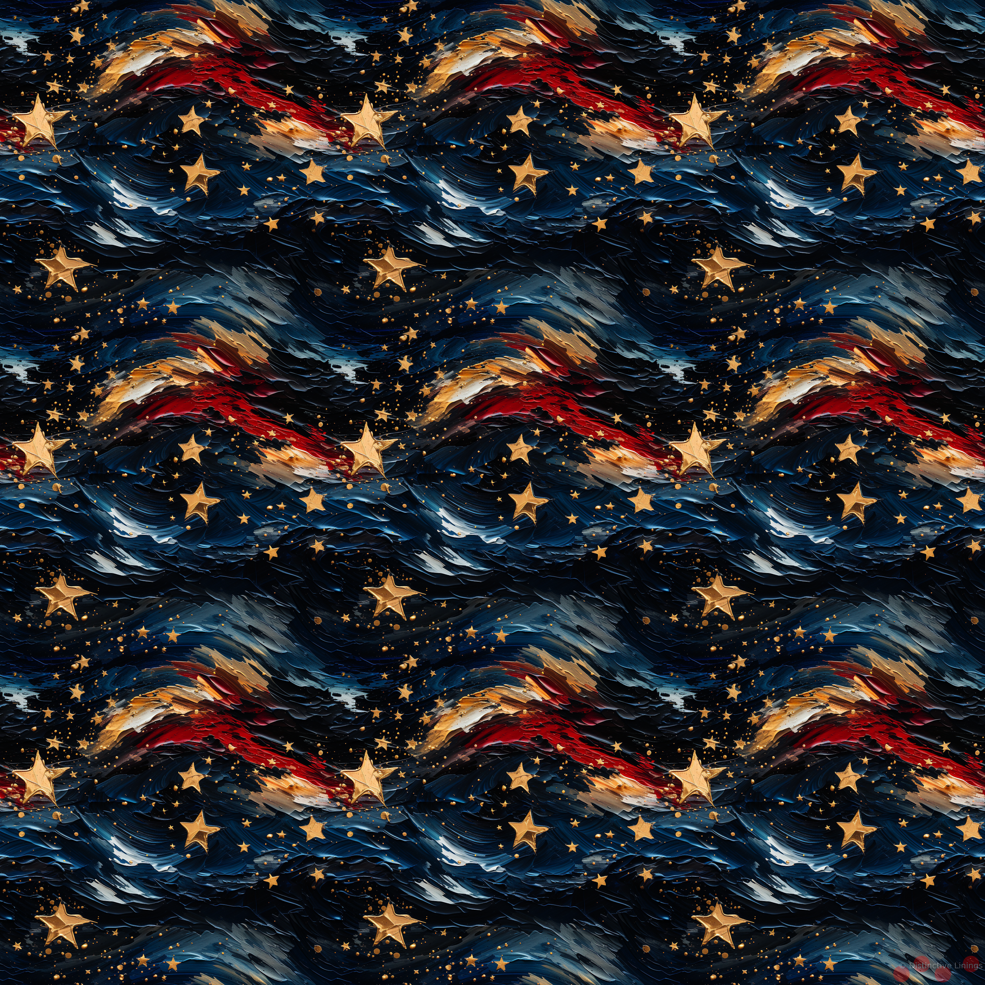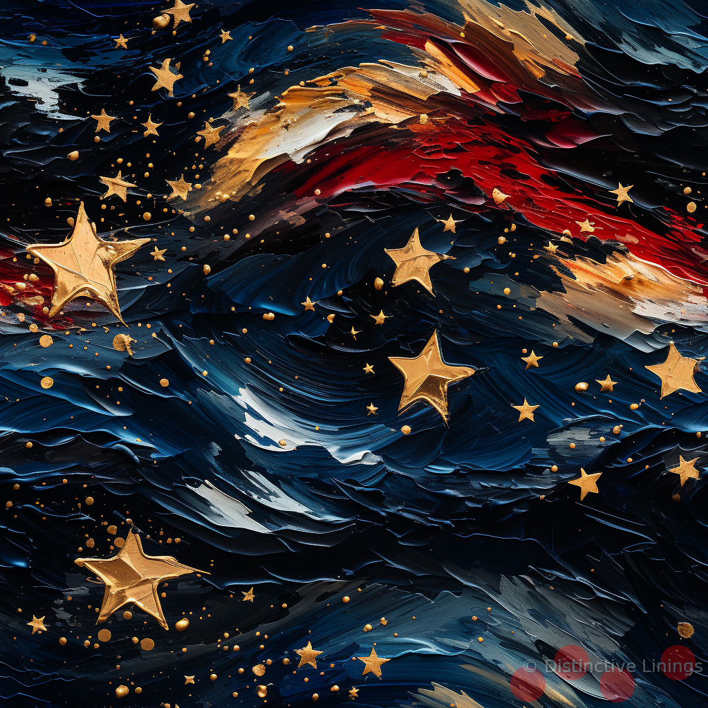 Escape into a world of fashion distinctiveness with this exclusive jacket lining. The encapsulating design, reminiscent of Post-Impressionism, swirls boldly within the confines of sophistication. A celestial panorama embellished with stars and stripes, is presented against a backdrop of deep blue, arresting the imagination with its sheer expanse.