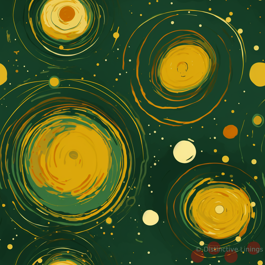 Experience the enthralling charm and personalized style with this jacket lining. Inspired by the illustrations reminiscent of E.H Shepard, this design showcases the motif of Retrograde Planets in a vibrant array of colors. The dynamic swirls of goldenrod are artfully juxtaposed with strokes of darkslategray, creating a compelling visual intrigue. Understated hues of darkolivegreen and olivedrab are seamlessly integrated into the design, adding depth and richness to the overall aesthetic. Subtle hints of gray are sporadically speckled across the lining, further enhancing the allure. This unique jacket lining promises a visual sensory delight, taking your personal style to an unsurpassed level of sophistication. The uniqueness lies in the intricacies of the design and its custom-made nature, setting you apart from the mainstream. Be ready to embody an exclusive look primed to exude individuality and a refined sense of style.