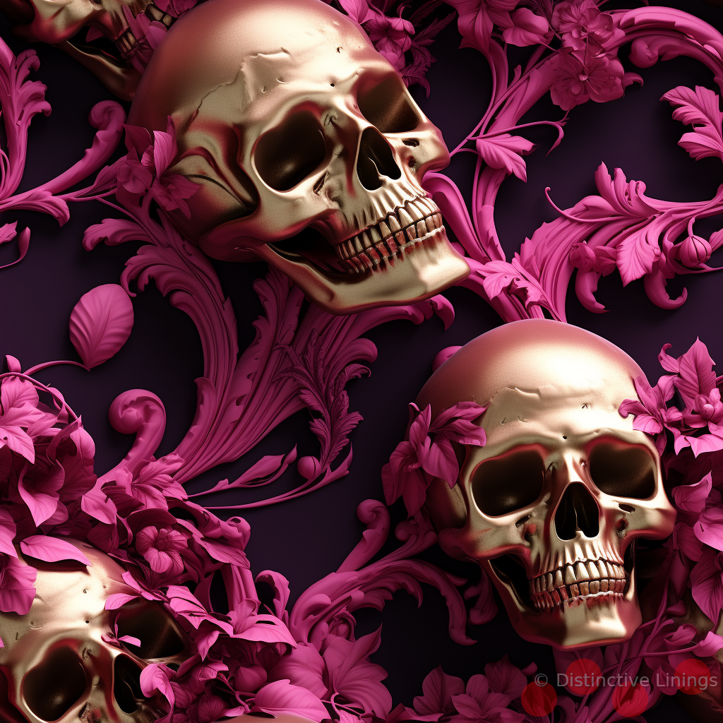Experience a lavish infusion of art and fashion with our avant-garde jacket lining, featuring a mesmerizing conceptual art design. The daring base color of black makes a bold statement, allowing the other incorporated tones to truly shine. Visuals of intriguing skulls dance playfully around the space, interspersed with strokes of pale violet red, accentuating the uniqueness of your style.