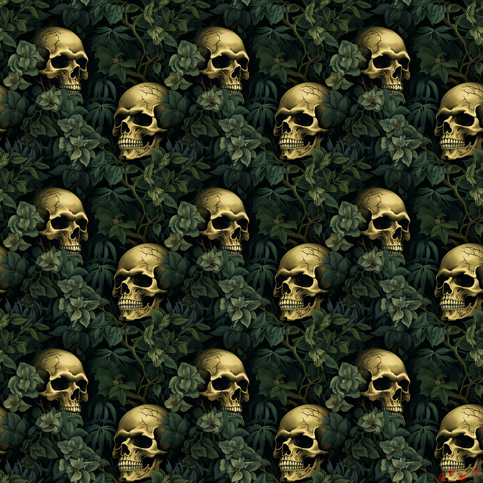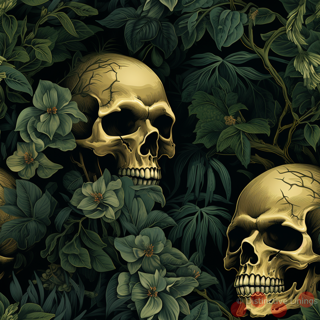 Embrace the sophistication of exclusive jacket linings featuring an exquisite pattern inspired by Arte Povera style. This distinctive design evokes a strong sensory impact, presenting a stunning blend of skull motifs in a tapestry of black and dual shades of gray. Accentuating the pattern further is an immersing dark olive green backdrop, delicately sprinkled with intriguing streaks of dark khaki. This unique lining is a testament to compelling visual vibrancy, ensuring every custom-made jacket provides its wearer a dash of individuality and high-end stylistic appeal.