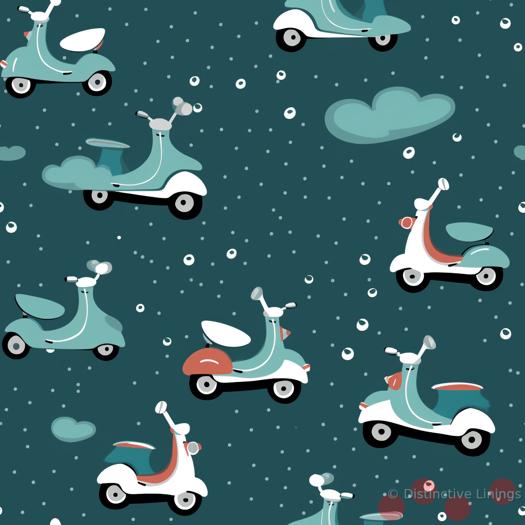 Unveiling a unique jacket lining with an artistic touch. Grab a glance at the pattern enveloping the essence of avant-garde artistry reminiscent of abstract expressionism. Meticulously crafted, it embodies a mesmerizing arrangement of scooters in a dance between structure and spontaneity.