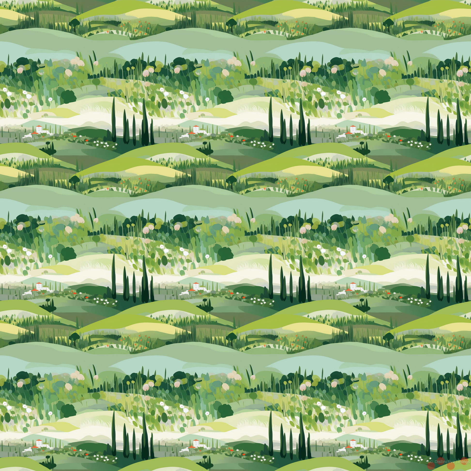 The color scheme comes alive owing to splashes of dark sea green and hues of dark slate gray, tempered by the cooler shade of gainsboro, adding a calming contrast. Butter-like hints of pale goldenrod are scattered throughout the design, providing warm undertones. To complete the Tuscan ambience, delicious strokes of chocolate enrich the overall look.