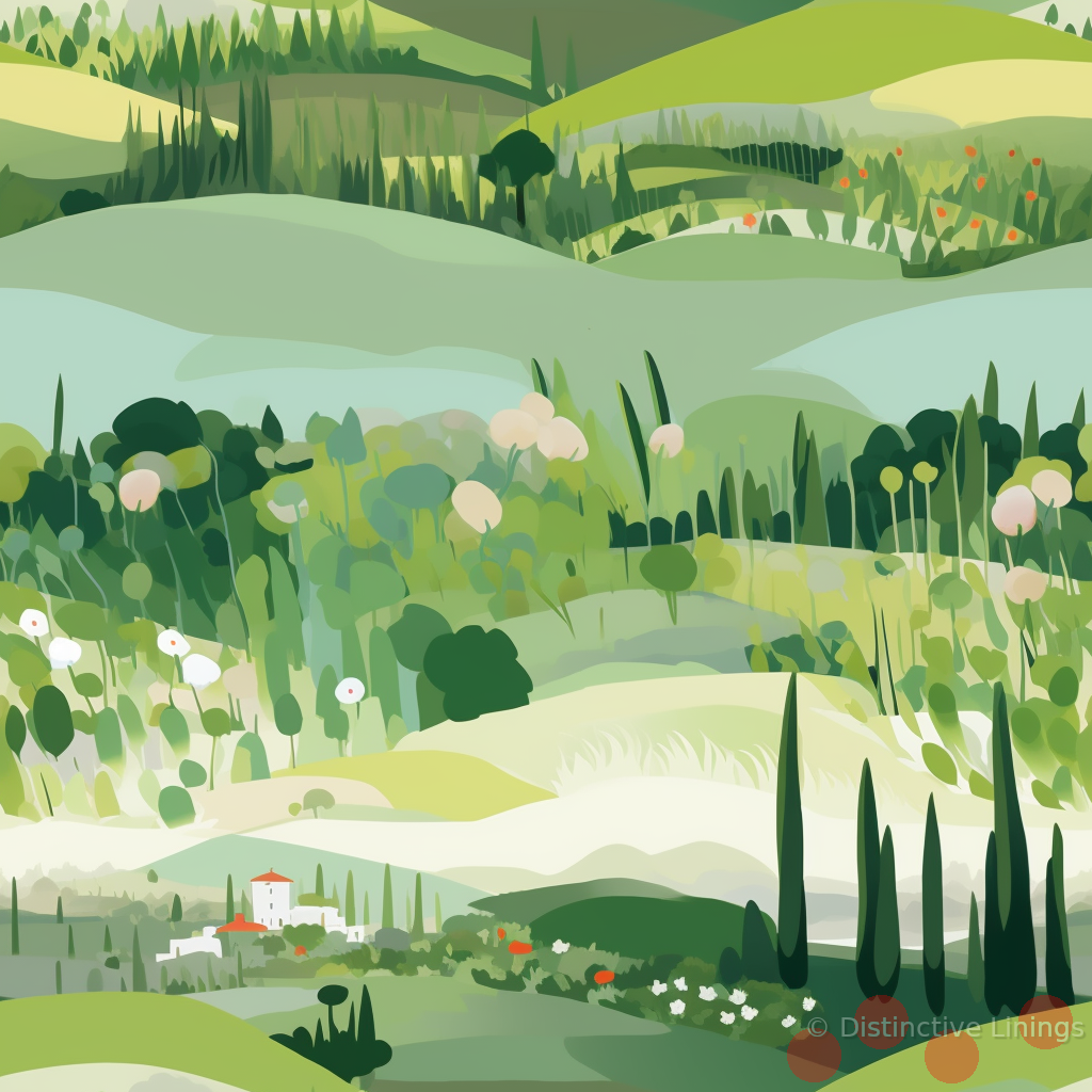 Stepping into the realm of the handmade, this jacket lining features an exclusive design that is reminiscent of Alex Katz style landscapes. Vividly expressive, the lining paints a stunning picture of the Tuscan green hills, mirrored against the serene skies of the Mediterranean - a visual feast for the discerning eyes.