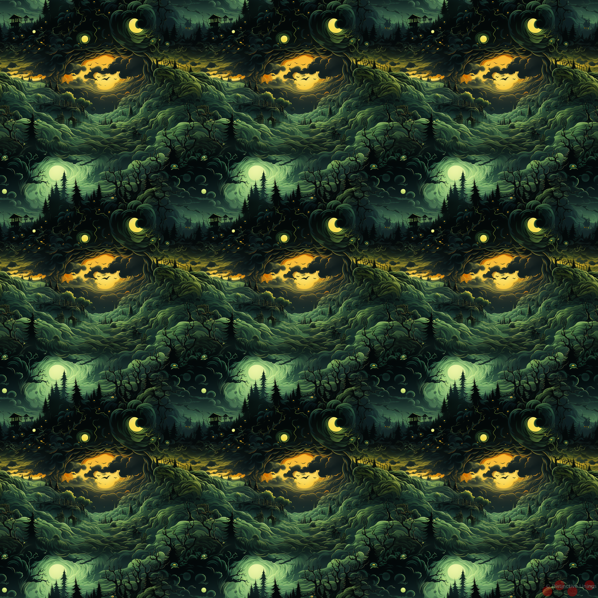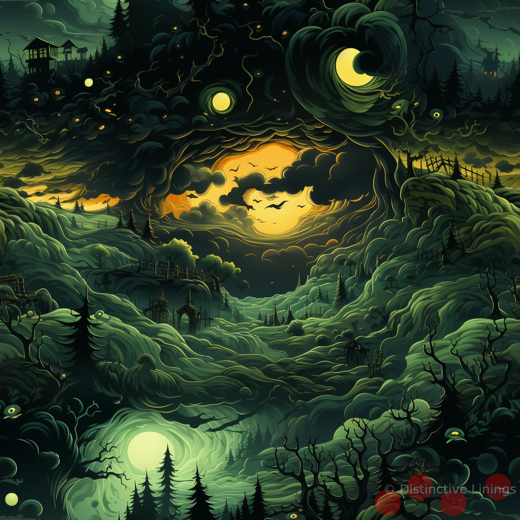 Experience unparalleled sophistication with this uniquely designed jacket lining. Drawing inspiration from the evocative style of comic strips, the pattern captivates your eye with playful depictions of zombies. The bespoke design is imbued with a complex palette, emphasizing shades of deep forest green as the dominant color.